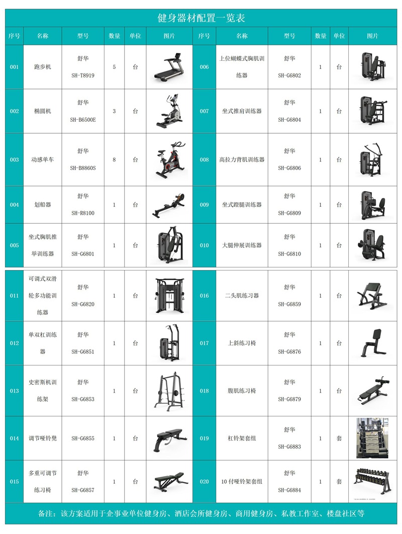 此方案要求面积小于350平米,我们会根据实际情况和场地面积而定。此方案推荐企事业单位健身房、酒店会所健身房、学校健身房、部队健身房等配置。能满足20-30人同时健身使用。