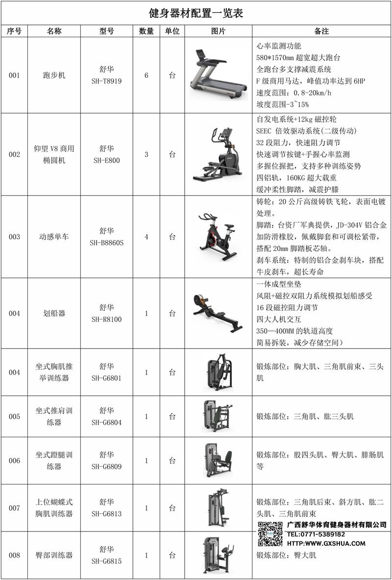 1.南宫NG28V9智能跑步机SH-T8919*6台-独立仪表-简洁大气,全新外观设计,健康运动新选择;心率监测功能,可通过手握心率、无线心率带等不同方式实时采集心率数据;580*1570mm超宽超大跑台-跑感舒适,跑台整体安全稳定;全跑台多支撑减震平台,保证跑台超强支撑力,达到180kg支撑,满足专业健身房需求。F级商用马达-超强马达,AC 3.0HP 交流,峰值功率达到6HP,F级商用品质。速度范围达到0.8-20km/h;V9跑步机可实现跑台扬升功能,坡度范围-3~15%,满足客户不同的锻炼需求。