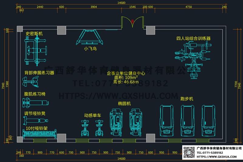 此方案要求面积小于109m²,适用于企事业单位、酒店会所、楼盘社区、工作室、学校等健身场所,能满15-20人同时健身使用。(方案根据场地空间大小、预算、产品需求等进行配置仅为启发性参考)